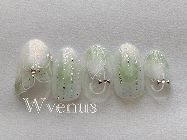 押し花を使ったネイルは、透明感のある仕上がりが魅力です。