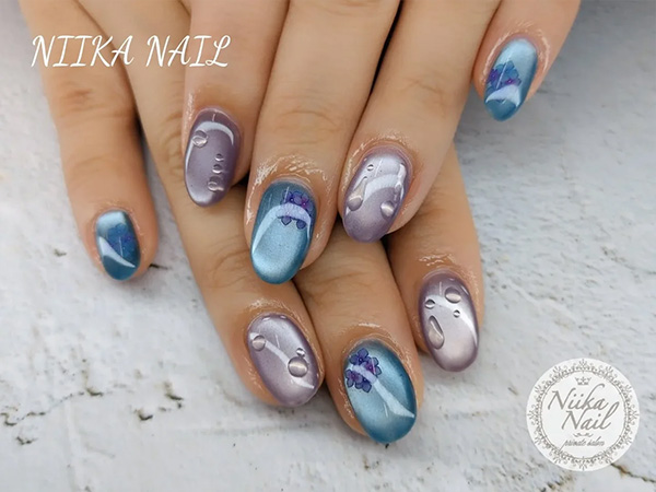 フラワーネイルに水滴を加えた、梅雨らしいデザイン。紫陽花だけでなく、小花柄と組み合わせても可愛く仕上がります。