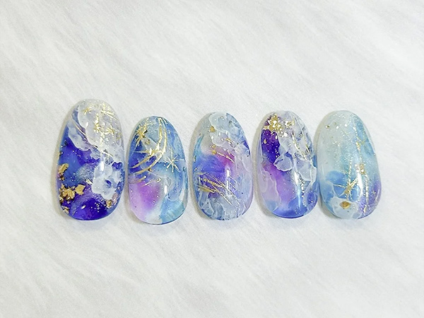 ブルーやパープル、グレーを混ぜたニュアンスネイルも人気です。雨や雲のような雰囲気が出て、梅雨らしいデザインになります。