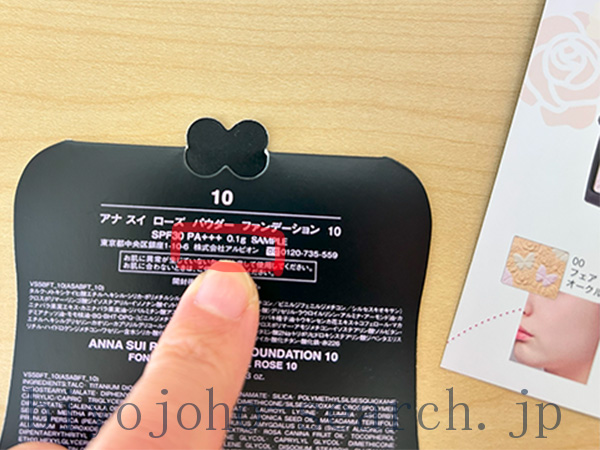 「ローズ パウダー ファンデーション」は、送料のみでサンプルを取り寄せることができます。サンプルで試せるカラーは10:ライトオークルのみですが、仕上がりやくずれ方を確認するにはよいでしょう。