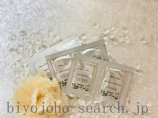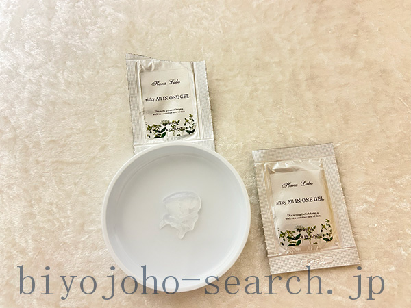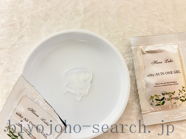 今回はサンプルパウチでのお試しです。「silkyオールインワンジェル」は透明なテクスチャーで、みずみずしい使い心地です。しっとりしますが、ベタつきは残りません。手に塗ってみた限りでは油膜感もないので、肌質を問わずに使えると思います。